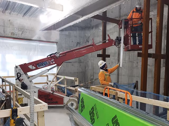 The Junior mini crane navigates narrow shafts, installing studs and drywall safely in multistory vertical construction zones.
