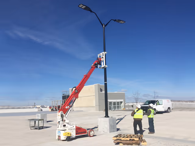 Robot-equipped Brandon 6 facilitates repetitive light pole removal and replacement with speed, safety, and ergonomic control.