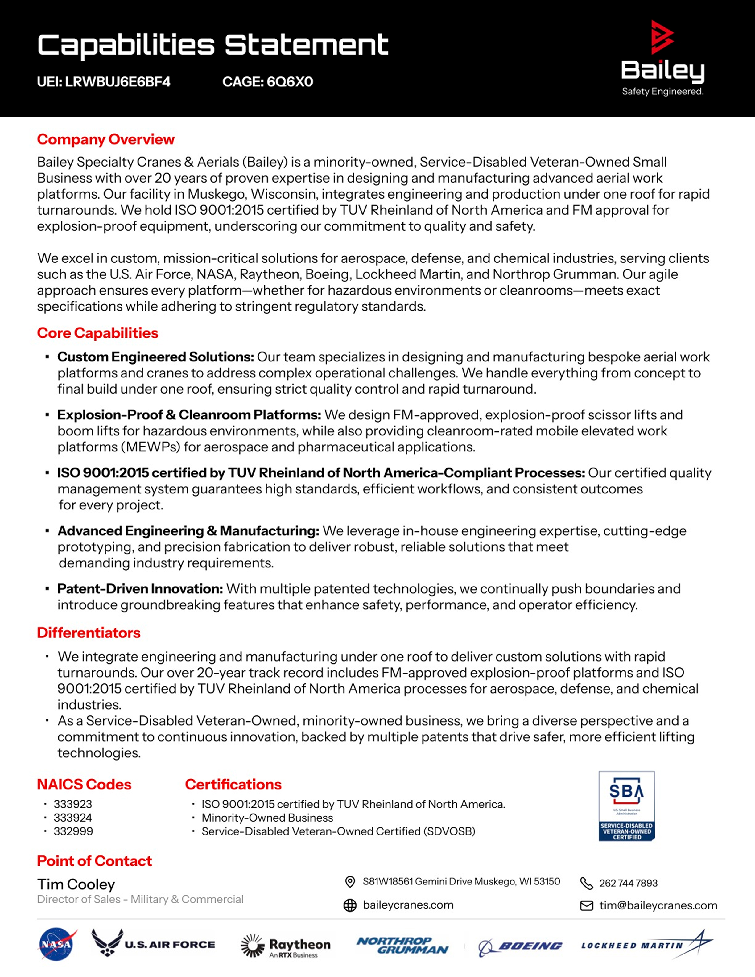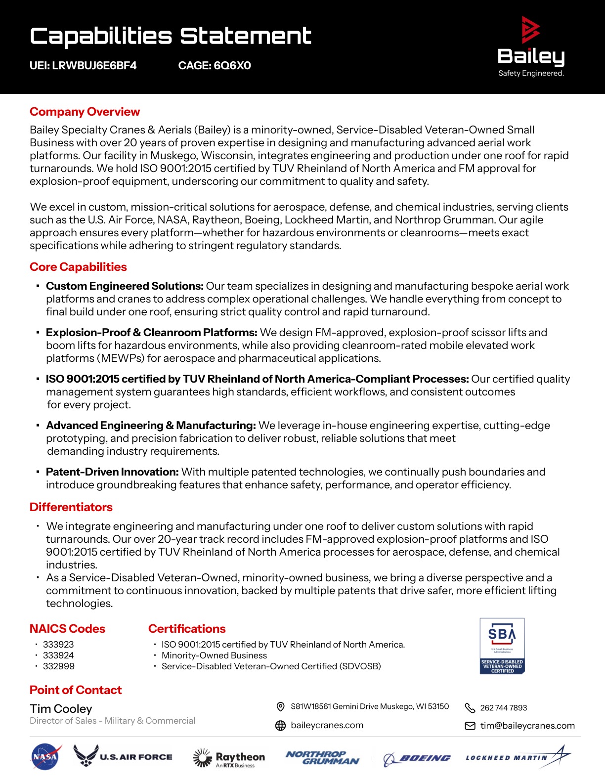 Bailey Aerials is a Service-Disabled Veteran-Owned engineering and manufacturing firm based in Muskego, Wisconsin. We specialize in precision access solutions for industries where the margin for error is zero.